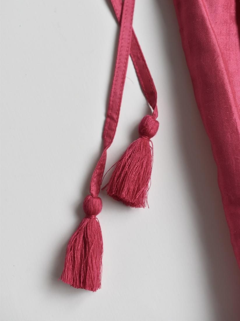 脇のタッセルリボンで巾着のようにキューっと絞る仕様。